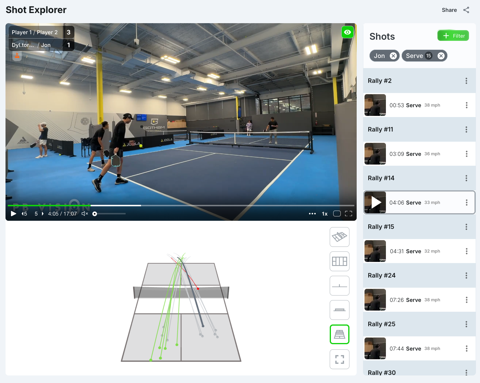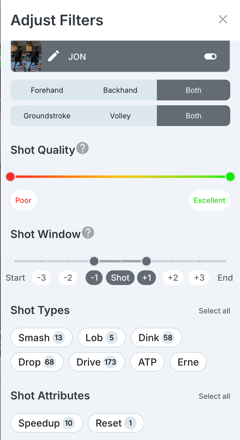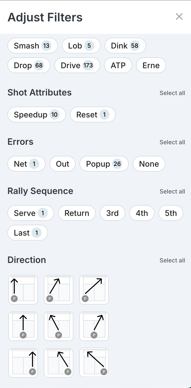 Shot explorer is probably where I spend most of my time. You can drill down into individual shots: serve, return, smash, drives, resets, etc. The app will also categorize your shots by quality (Excellent 🟢 | Average ⚫️ | Poor 🔴) attributes, error, and direction. Since I’ve been focusing a lot on my drops, I filter out my shots by “drop” and I can watch every single one of mine in one go with a few clicks.