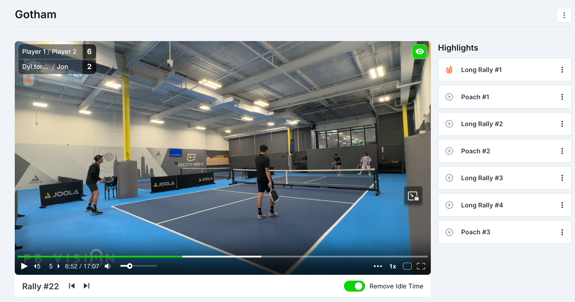 A single game of pickleball might take 15 minutes, but you’re only playing for a few of them. When you upload a video to PBVision, it automatically cuts dead time, trimming the clips where you’re picking up the ball, arguing about the score, or taking a timeout.