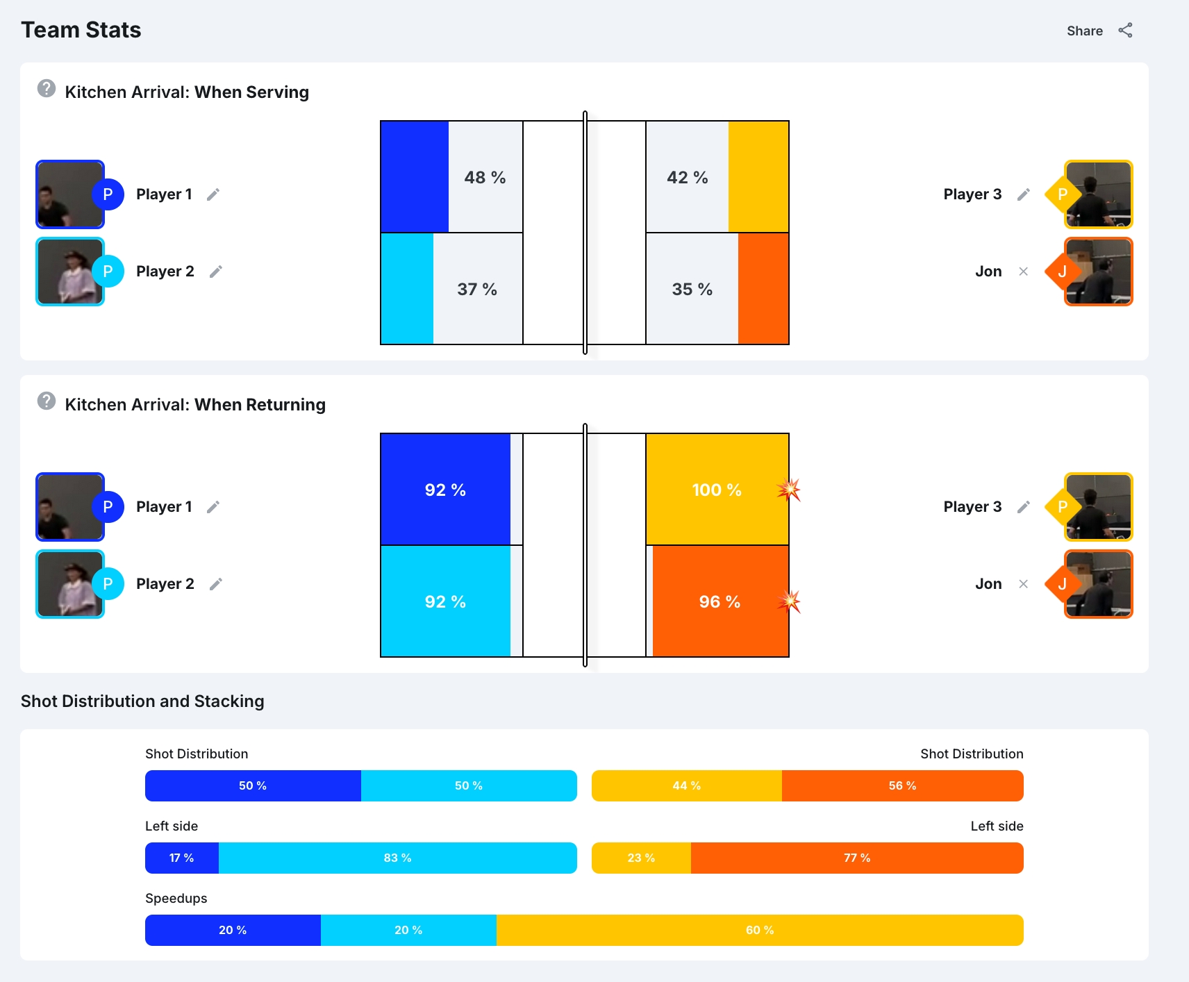 The two reports I check after every game are “Team Stats” and “Player Performance.” In the Team Stats section, you’ll see how many times you reached the kitchen when serving and returning — one of the most important metrics for judging whether we put ourselves in advantageous positions throughout the game.