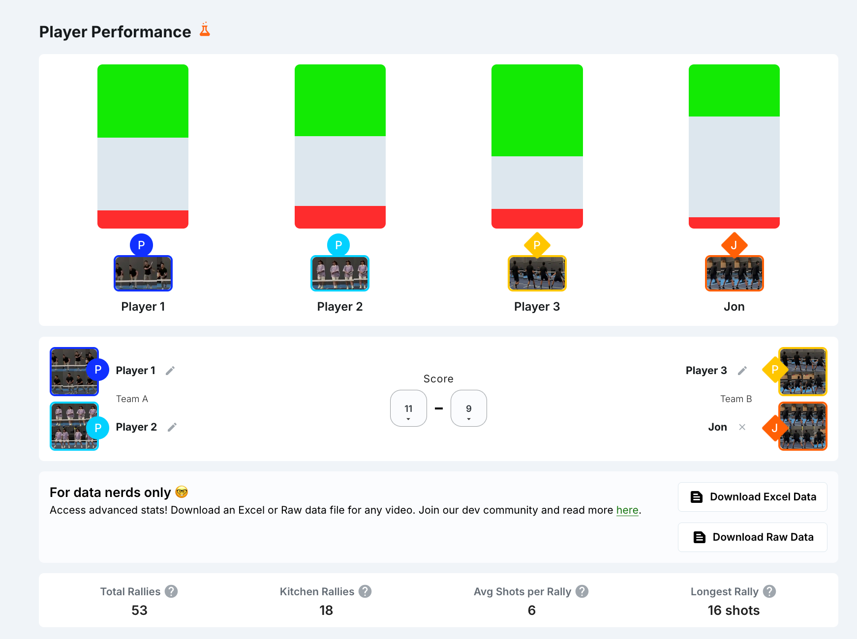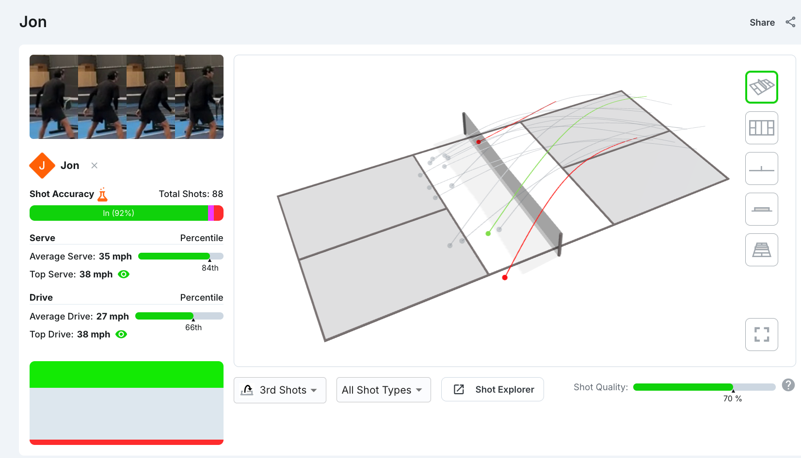 You’ll also see the percentage of shots each player of each team took, total rallies, kitchen rallies, average shot per rally, and longest rally. And each individual player will get a drilldown of their shot quality.